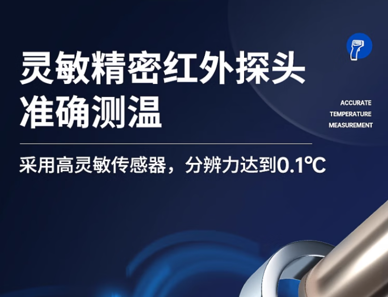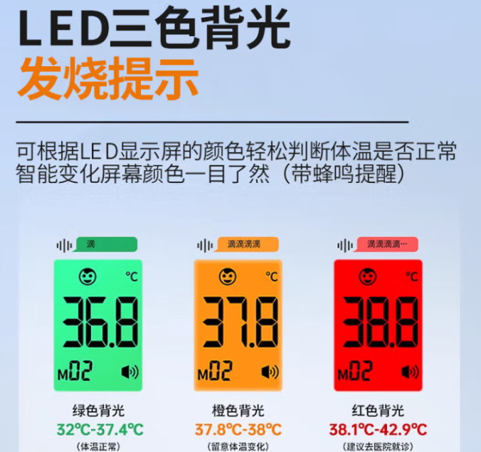 灵敏精密红外探头准确测温 采用高灵敏传感器,分辨力达到0.1℃ |可根据LED显示屏的颜色轻松判断体温是否正常智能变化屏幕颜色一目了然(带蜂鸣提醒) 对准眉心3-5厘米,一按即测,快捷省心不再担心宝宝不配合,老人不会用